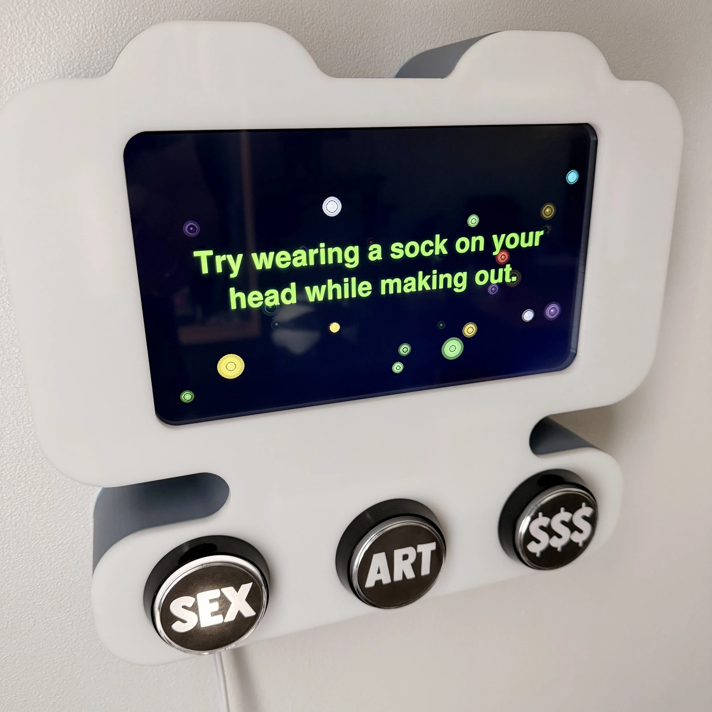 Limitless Bad Advice confronts our contemporary faith in artificial intelligence by leaning into the dubious nature of its advisory capacity. Rather than offering solutions, this piece provides deliberately flawed counsel on three aspects of human existence: desire, creative expression, and finance. The device feeds a compulsive need for guidance while acknowledging the challenge of authentic advice from systems incapable of genuine understanding.